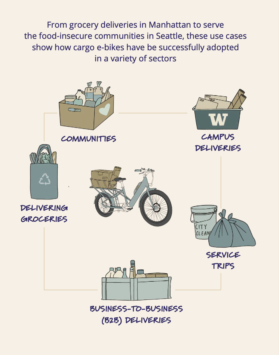 According to the University of Washington’s Urban Freight Lab and nonprofit People for Bikes, cargo bikes could play a major role in greening the delivery sector, which is responsible for a staggering 28 percent of greenhouse gas emissions in cities worldwide. Ultra-heavy freight trucks and vans, meanwhile, are significantly more likely to kill any pedestrians and cyclists they might strike, in addition to blocking crosswalks and bike lanes, which can cause crashes with other vehicles.