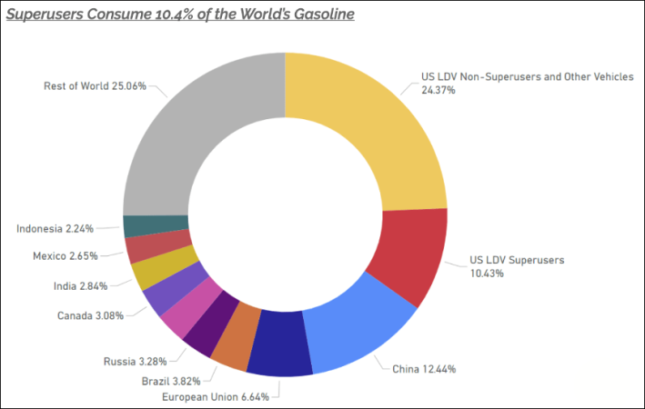 According to a sprawling new analysis conducted by the pro-EV nonprofit Coltura, roughly 10 percent of U.S. motorists — or 21 million people — are driving an average of 110 miles every day. And because those same motorists are more likely to drive fuel-inefficient vehicles like SUVs and pick-ups, they collectively account for 35 percent of the nation’s total annual gasoline use — only slightly less than the fuel consumption of the entire population of China, and nearly 60 percent more than the entire European Union.