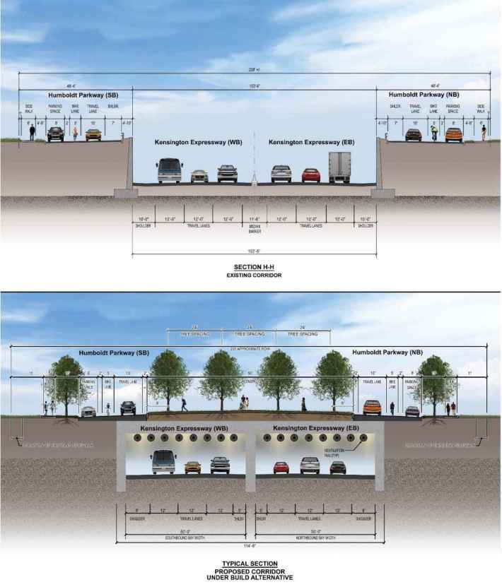 Now, six decades after the Kensington Expressway was completed, state officials are promoting a redevelopment plan that would create a “cap” over one portion of the Kensington. The so-called ”cap” would create a concrete surface on top of the highway that would enclose this portion of the highway, turning it into a tunnel. The tunnel would be covered with three feet of soil, on top of which eleven acres of grass, trees, and other green space would grow.