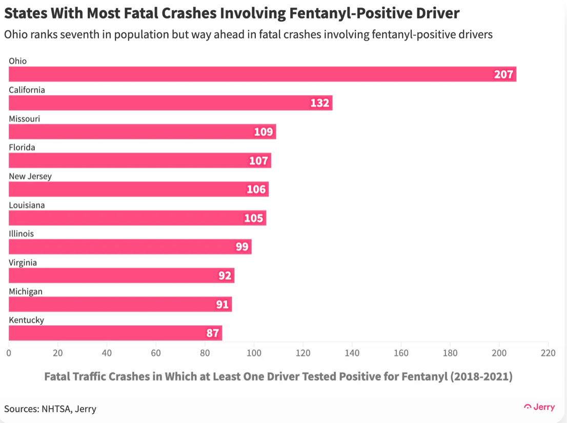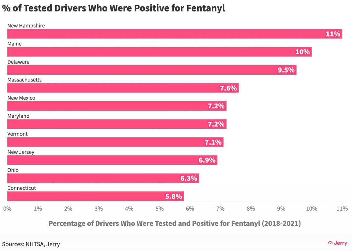 According to a recent analysis from the digital insurance broker Jerry, a disturbing four percent of all drivers who were tested for drugs following a fatal crash in 2021 were found to have the potent synthetic opioid in their system, up from two percent in 2018.