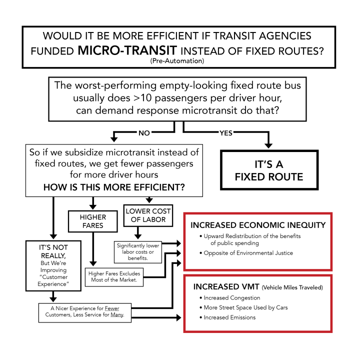 “Everybody understands how Uber and Lyft constantly screw over their drivers, right?,” adds Gena. “We see a lot of similarities with [microtransit] — and in some ways, it’s even worse, because we’re funding all of this with our tax dollars. At least with Uber and Lyft, people are paying out of their pocket. But if someone’s paying $1 or $2 for a micro transit trip that might be costing the agency $40 or $50, we’re all subsidizing an inefficient service that incentivizes the destruction of good jobs.”
