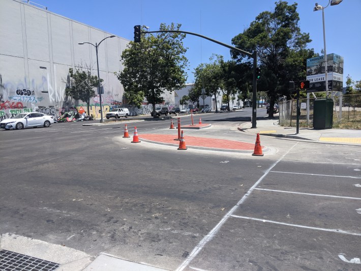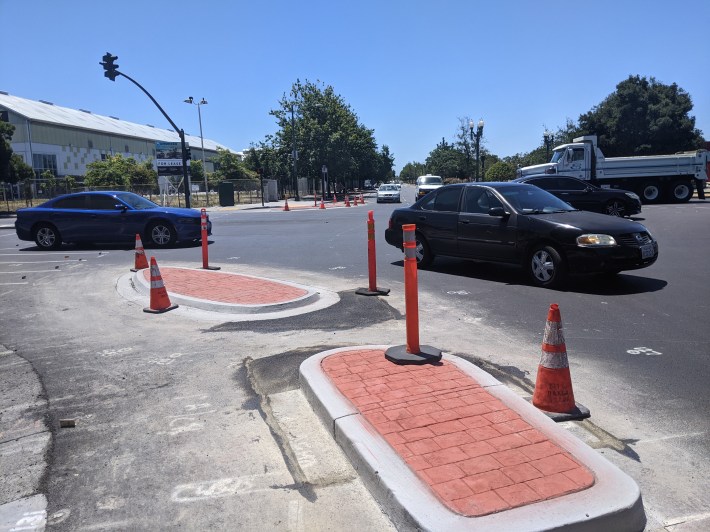 The city is also planning to build protected intersections at Parkway, Adeline Street, and Market Streets. The protective islands haven’t started construction at the other intersections, but there’s roughly painted markings to guide the installation and there’s already smooth new pavement.