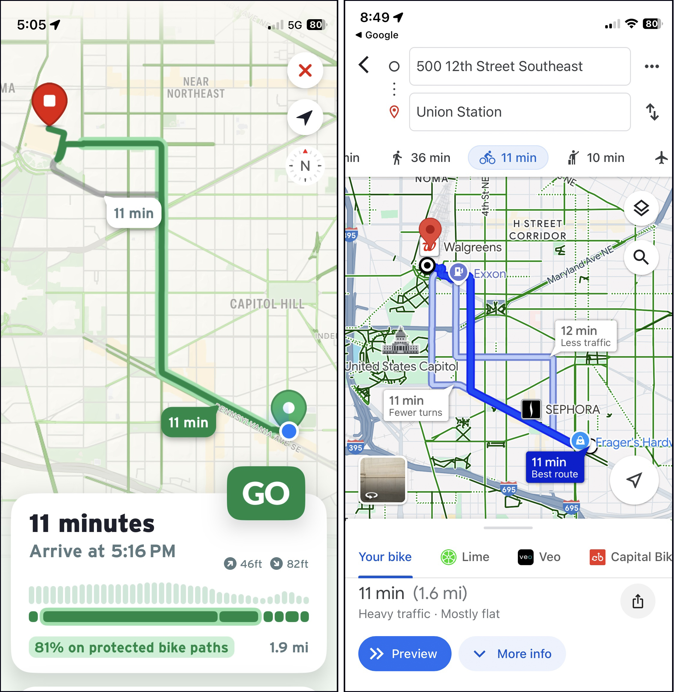 The riding experience was almost the same with the exception of navigating the busy left turn onto Massachusetts Avenue. Transit app did offer the user additional information, like what percentage of the ride includes protected bike path vs. bike lanes and busy streets. And iconography inside the app lets riders know which road they are using, which can be helpful when making route decisions.