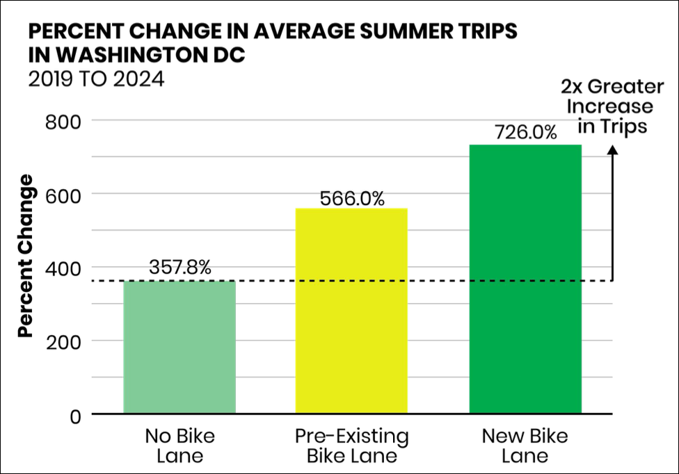 In D.C., a major metro with a population just shy of 700,000 residents, new and especially protected bike lanes led to a huge boost in riding compared to existing infrastructure or streets with no bike lanes, according to Lime.