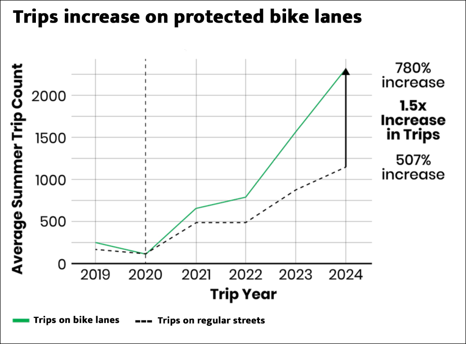The company said trips on its bikes increased by 128 percent between 2020 and 2023 — but trips on new bike infrastructure jumped 726 percent while trips on streets with no bike lanes “only” increased by 358 percent over the same period.