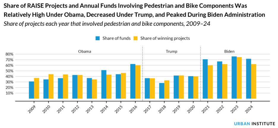 In a new report, researchers at the Urban Institute analyzed how equitably the last three administrations have distributed funds from the Rebuilding American Infrastructure with Sustainability and Equity program (aka RAISE grants), which is not only one of the U.S. DOT’s largest programs, but also one of its most flexible.