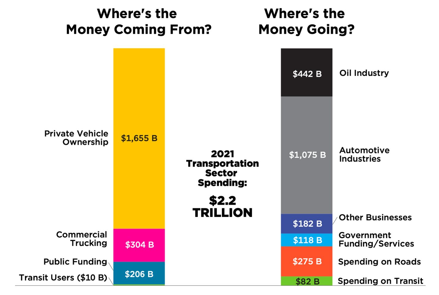 Put it all together, and the researchers say that auto and oil industries “receive up to around 75 percent of all the money – private and public funds — that we spend on transportation.”