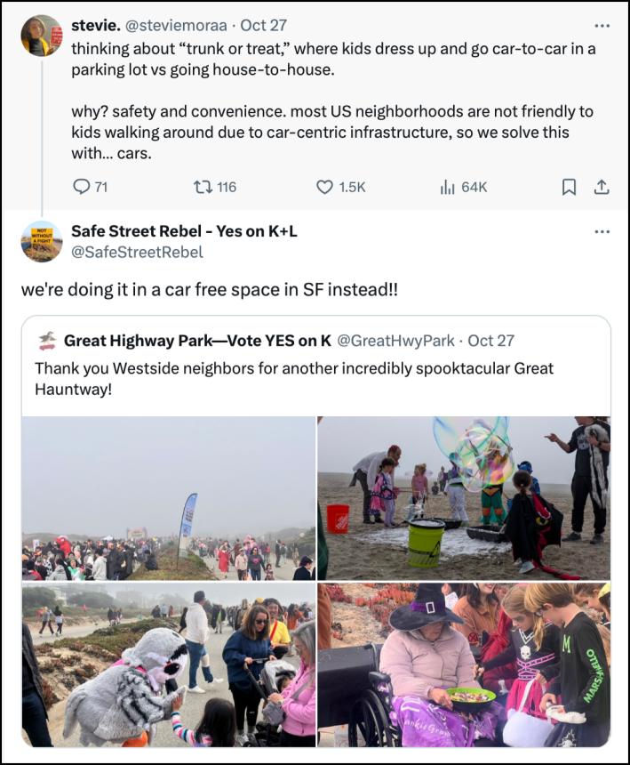 The movement to end car dependency, ultimately, is not the movement to end cars, or any of the deeply ingrained car-centered community rituals that come with them. It’s about giving people options about how they move through and relate to their cities — so everyone can choose to trick-or-treat in their neighborhood one night, and trunk-or-treat with their school community the next.