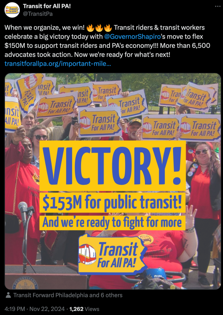 “It’s a really effective political tactic to compel our some of our republican and rural legislators to [come to] the table for a broader funding solution,” said Laura Chu Wiens, executive of Pittsburghers for Public Transit, who organized with colleagues across Pennsylvania for the recent shift. “We’re looking at another big legislative fight in the spring, but … [lawmakers] don’t want this to continue happening, where money is being pulled from highways to fund transit. So I think they have a vested interest in actually negotiating now.”