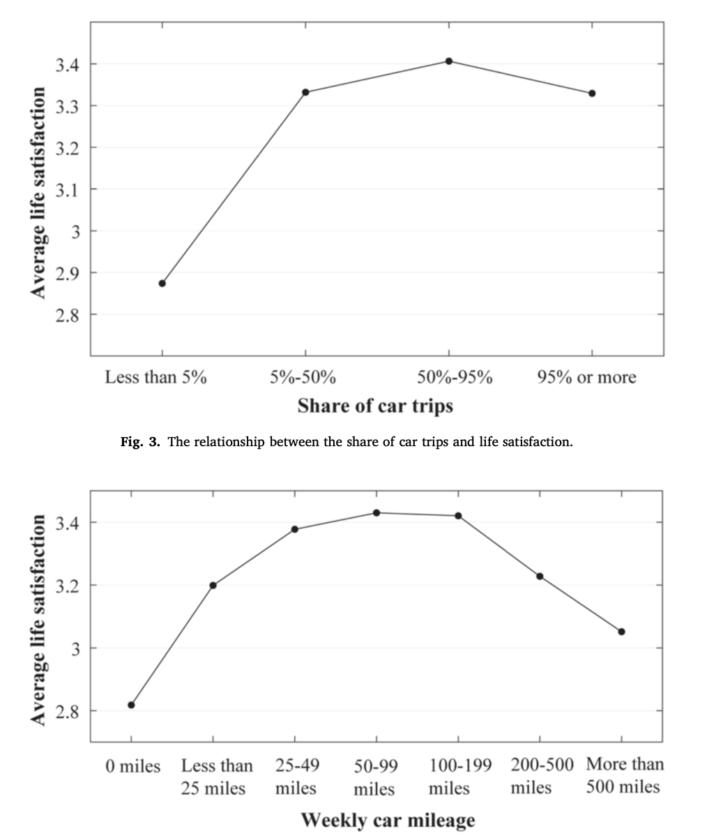 The study isn’t an out-and-out win for team “cars are making us miserable.” Survey respondents’ overall “life satisfaction” actually rose in tandem with the percentage of trips they took and miles they traveled inside of private automobiles, at least before they hit those 50 percent or 200-mile-a-week tipping points. In car dependent contexts, trying to get around without one can be a miserable, deadly, and demoralizing undertaking — and typically, only those who truly have no other choice even dare to try.