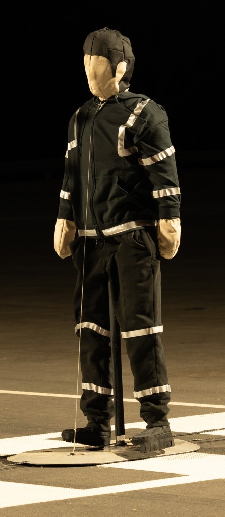 In the study, researchers outfitted an adult-sized dummy in black clothing, one in white clothing, one with a reflective jacket and one with a reflective strips in a configuration similar to those worn by roadway workers (though their safety gear is generally bright orange or yellow rather than black).