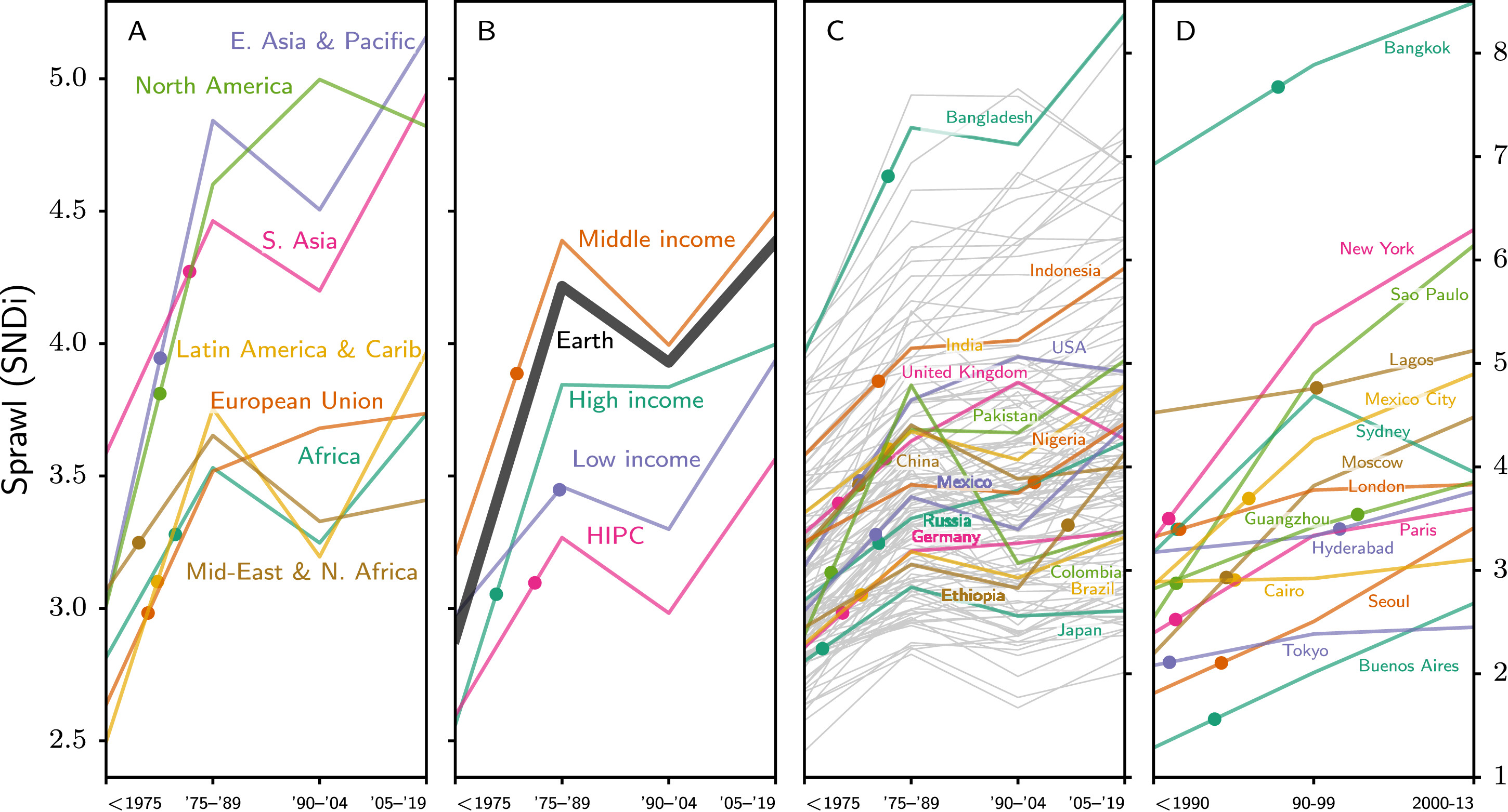 Places like Japan and Argentina, meanwhile, ranked among the most-connected countries on the planet, even if previous sprawl studies didn’t recognize them as standouts. The researchers explained that while those nations’ non-gridded street patterns don’t closely resemble connected communities in North America, they still offer ample cut-throughs for people outside cars, and other innovative strategies to shorten traveling distances.
