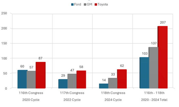 Report author Adam Zuckerman acknowledged that Toyota isn’t the only automaker that has fought to elect carbon-increasing politicians, and that political action committees attached to Ford and General Motors do it, too. In recent years, though, Toyota has pulled ahead of both those PACs, donating to more than four times as many climate deniers as Ford and nearly twice as many as GM — and doing so in dollar amounts more than double the latter and nine times the former.
