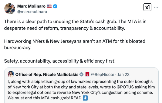 But as a MAGA-aligned representative running for re-election to the House in 2024, Molinaro struck a decidedly different tone, calling congestion pricing “a bad, unpopular idea to begin with” while reiterating his longstanding calls to take on “the waste, bloat, and corruption plaguing New York and the MTA.” Last summer he called on Congress to hold a hearing on congestion pricing, which never happened.