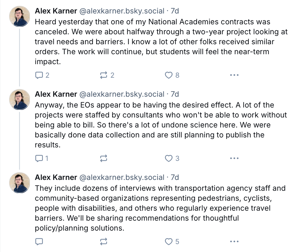 Researcher Alex Karner, for instance, was leading a team that had been awarded $500,000 more than a year ago to study how transportation agencies might broaden their understanding of “accessibility” to include the lived experiences of a wide range of travelers, and had already conducted dozens of interviews and focus groups in support of that research. When he received word that his grant had been canceled, though, he struggled to understand how his project even remotely qualified as the kind of “shameful discrimination” the Trump memo promised to root out.