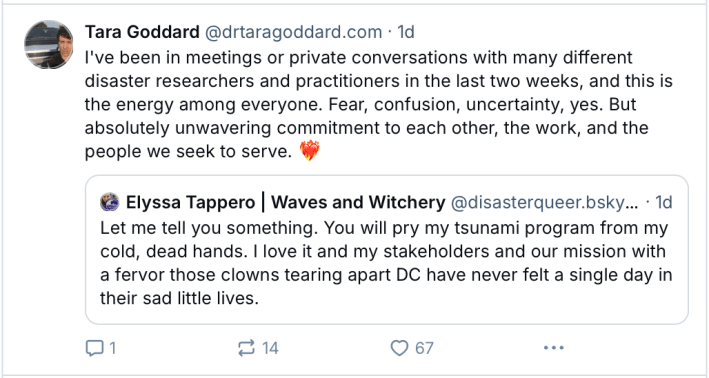 “Calling and emailing (and showing up in person, if possible) to your reps helps,” she added. “Mention the federal funding freezes and agency dismantling and NSF firings specifically. … Tie [this] to issues that matter where you are. I reminded my senators and congressperson that Texas has not had a day without a roadway fatality since November 2001.”