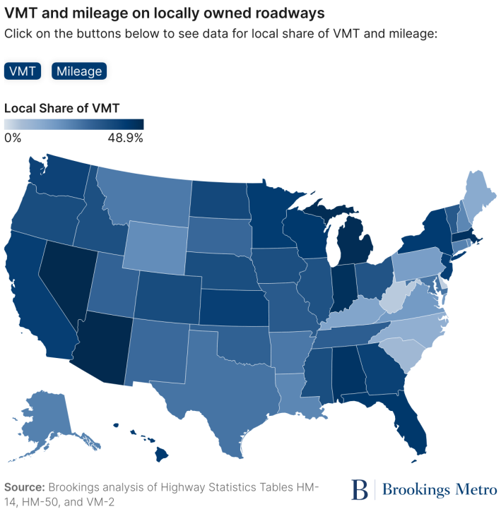 All those trips and distances add up to major use. Looking across all 50 states (but excluding Washington D.C.), locally owned roads carried 34 percent of national VMT in 2022.