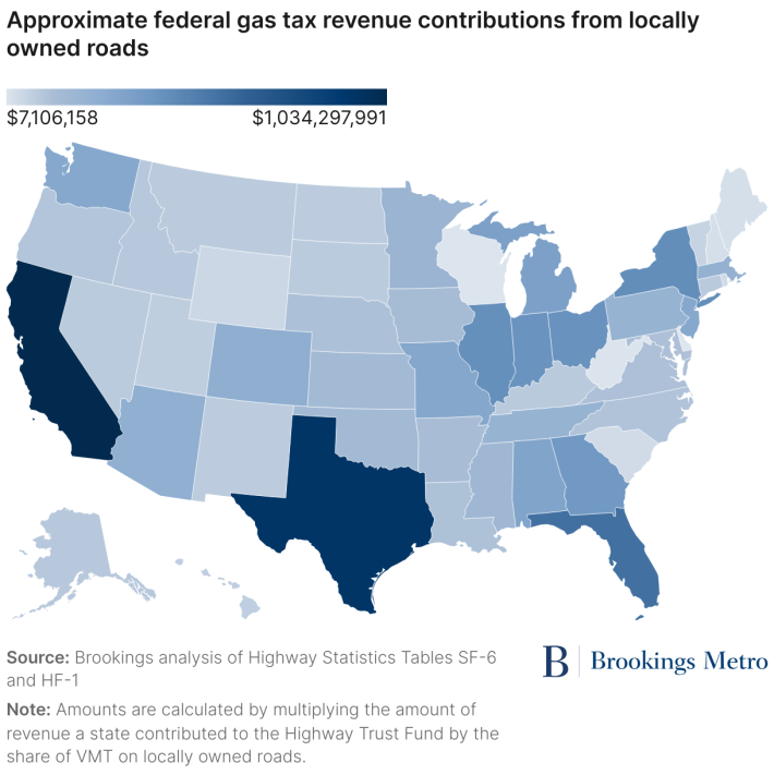 Those numbers are especially large in higher-population states with relatively high local VMT shares, such as California ($1 billion), Texas ($941 million), and Florida ($584 million).