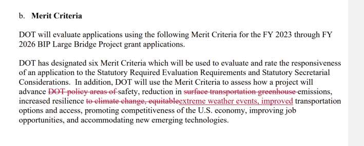 Going forward, applicants for the Bridge Investment Program no longer have to include “an equity assessment which evaluates whether a project will create proportional impacts and remove transportation-related disparities.”