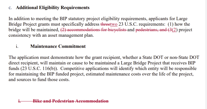 For instance, the federal highway code requires bicyclist and pedestrian accommodations under many circumstances (though experts say that no administration has properly enforced it). But Duffy’s new language no longer even pretends to require grant applicants to make “accommodations for bicycles and pedestrians,” as the screenshot below shows: