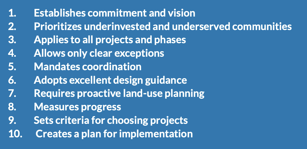 While those elements might be adjusted for the specific context of a corridor — say, building a protected bike lane on a wide arterial, but subbing that lane out for speed cushions on an already-narrow neighborhood road — a good Complete Streets policy won’t allow easy exceptions that leave vulnerable road users in danger. They also don’t allow projects to fall through the cracks when multiple agencies get involved, like when a city wants to build a crosswalk on a street they own that intersects with a dangerous state-owned collector.