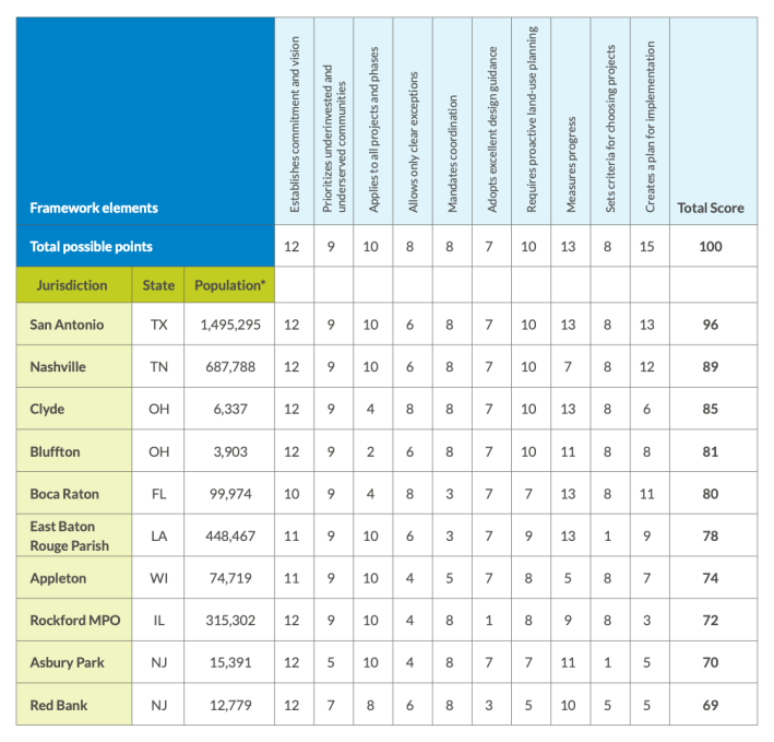 Top-ranked San Antonio, meanwhile, did their best to drag that grading curve up, scoring a stellar 96 this year after it revised its old policy to be more proactive about meeting performance measures with the establishment of a new “Technical Review Task Force” — and to better prioritize people who have been historically excluded from transportation discussions.