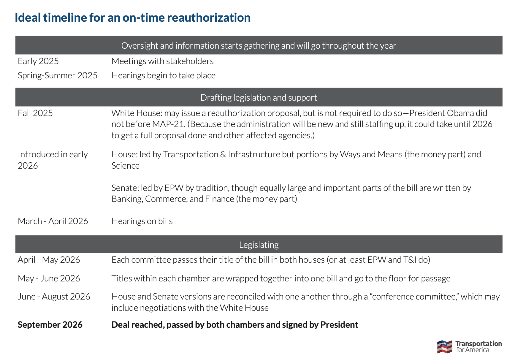 T4A has a much more detailed breakdown of how all this happens in their Reauthorization 101 guide if you’d like start blocking off time to watch a zillion hearings, but we’ll do our best at Streetsblog to give you the highlights as they happen (bookmark this page).