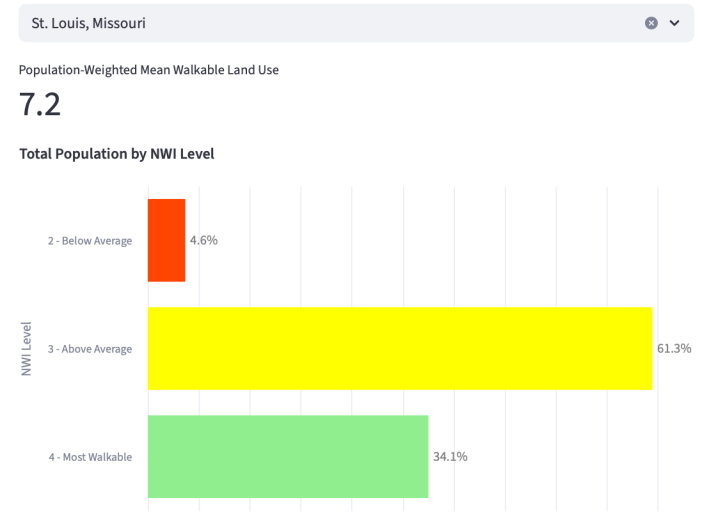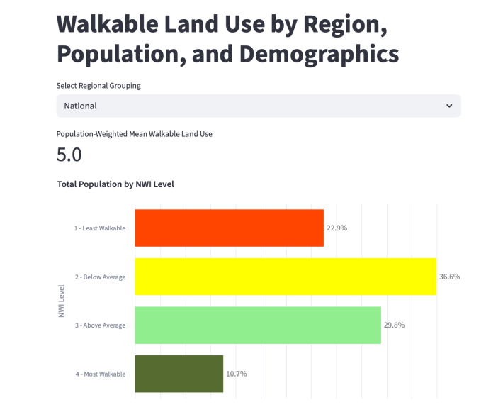Each geographical area (state, county, or city) has a number that measures walkable land uses weighted by population. We are not aware of any other walkability measure that attempts to answer how well states or cities are providing their overall population with walkable places.