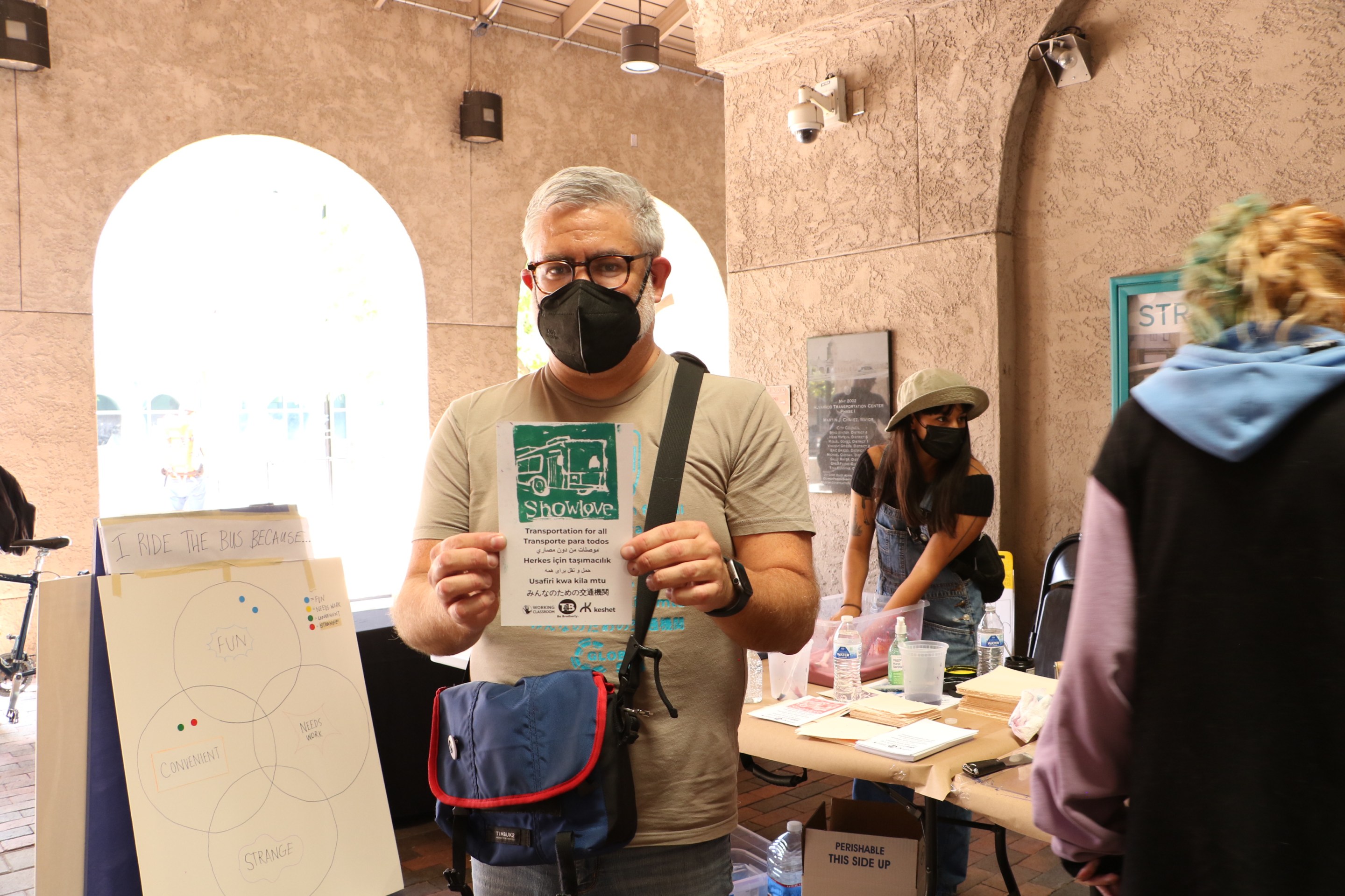 Together for Brothers (T4B) activist Christopher Ramirez advocates for fare free transit in Albuquerque in 2023.
