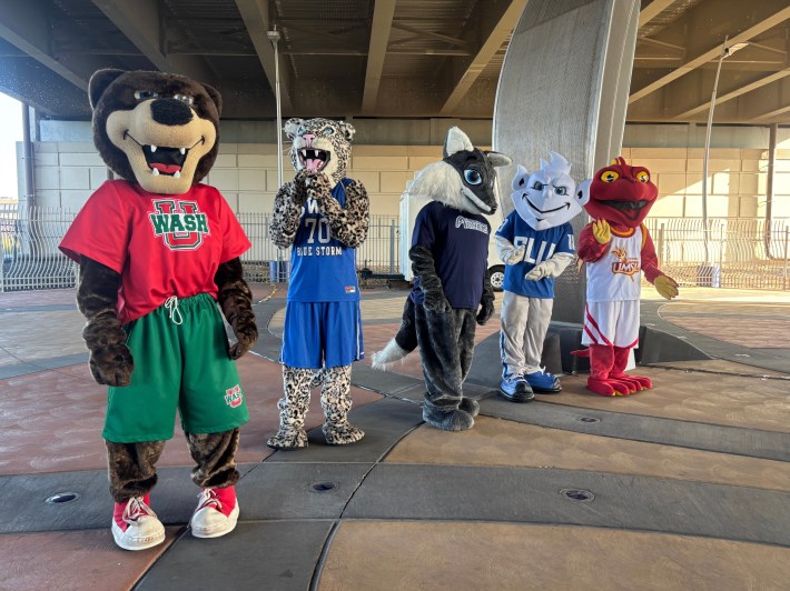 Kashmir, the Southwestern Illinois College Snow Leopard; Louie the UMSL Triton, the Wash U Bear, and Archie, the St. Louis University Billiken (editor's note: yes, that one requires some explanation) helped kickoff the daylong competition at the annual “Mascot Meetup” before hopping on the train to a breakfast celebration. Though Wash U’s Bear, true to his nature as a hibernator, slept through his alarm and arrived twenty minutes late.