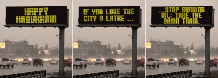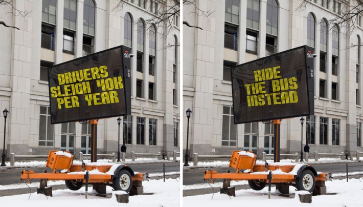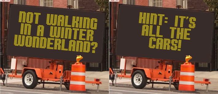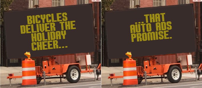 Of course, Streetsblog would never recommend that its readers hack a sign ... which is why we made these virtual ones, perfect for sharing without risking arrest! And just for fun, we gave them a little holiday twist ... and some of the worst puns we could think of.