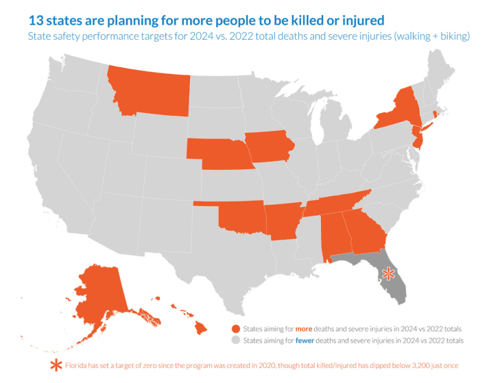 Under the Biden-era Infrastructure Investment and Jobs Act, which is set to expire in September, transportation officials can actually set a "goal" for more people to die on their roads in the next year — and at last count, 13 states were taking advantage of that disturbing technicality. Even states that do set declining fatality targets, meanwhile, don't actually have to do anything different if they fail to meet them, unless their total vulnerable road user deaths top 15 percent of all fatalities — which they often don't in dangerous, car-dependent states where few people walk and bike if they can even remotely avoid it.