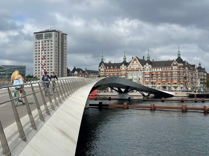 As Thoem recounts, transportation engineers projected that 3,300 cyclists would use the Bryggebroen over the Copenhagen harbor. Within months after opening, almost three times that projected number were cycling over the bridge, including one third who previously drove a car to get to and from Brygge Island. Further south, the twisting, 280-meter bike bridge dubbed the Cycle Snake was carrying over 20,000 cycles per day over the harbor only four years after it opened in 2014.