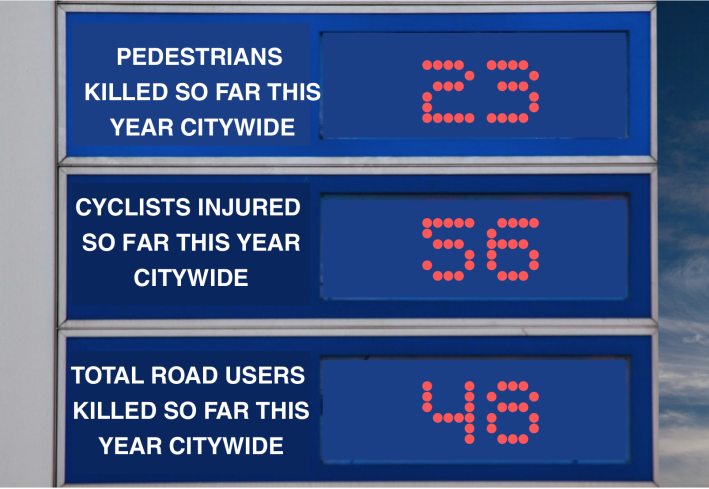 Fun fact: this daily tracker sign literally could not exist in most U.S. cities, since transportation officials usually only tabulate traffic deaths more than a year after the fact and bury them on a government website.