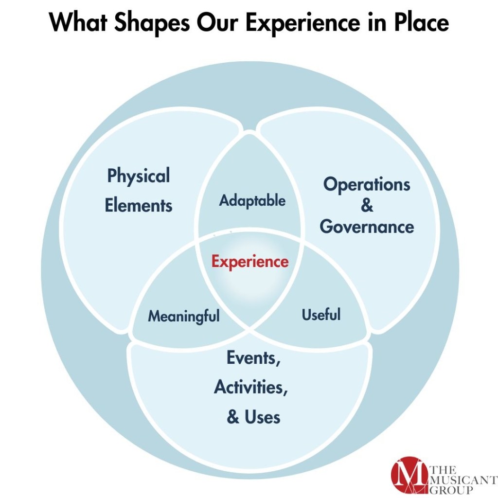 Great places deliver great experiences. These experiences are created through the interactions of the physical elements, operations, and uses working together to create a whole that’s greater than the sum of its parts.