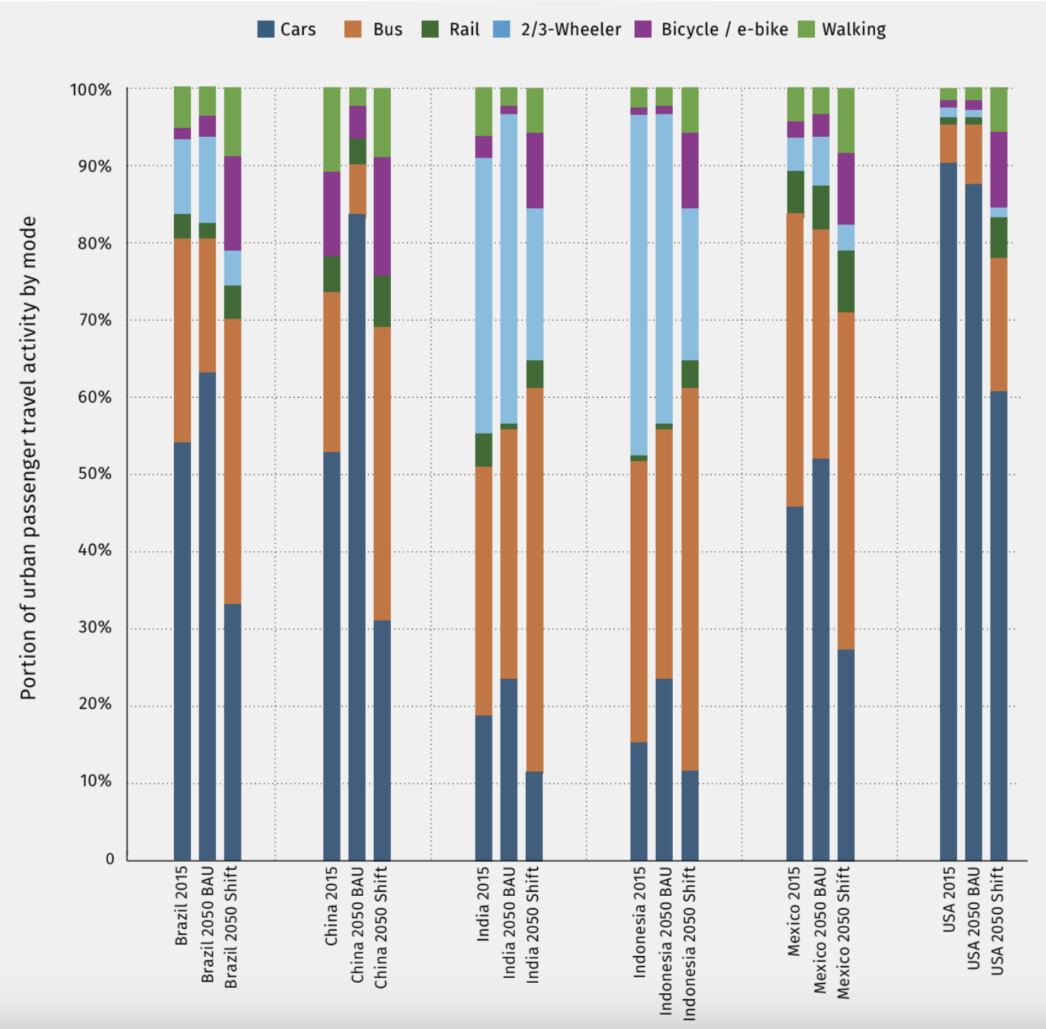Then, they compared that bleak vision with three other scenarios where their focus nations threw their weight behind just one transportation reform strategy — encouraging EV adoption, limiting vehicle sizes, or pushing for mode shift — and a final scenario where they combined all three approaches in one.