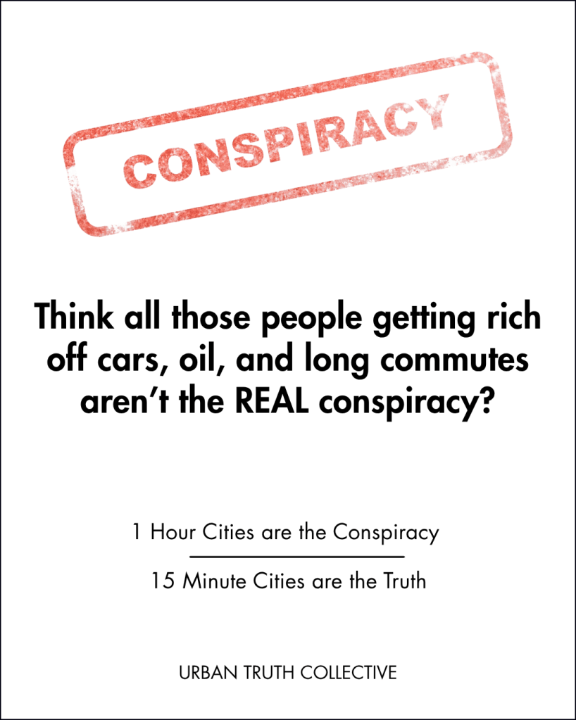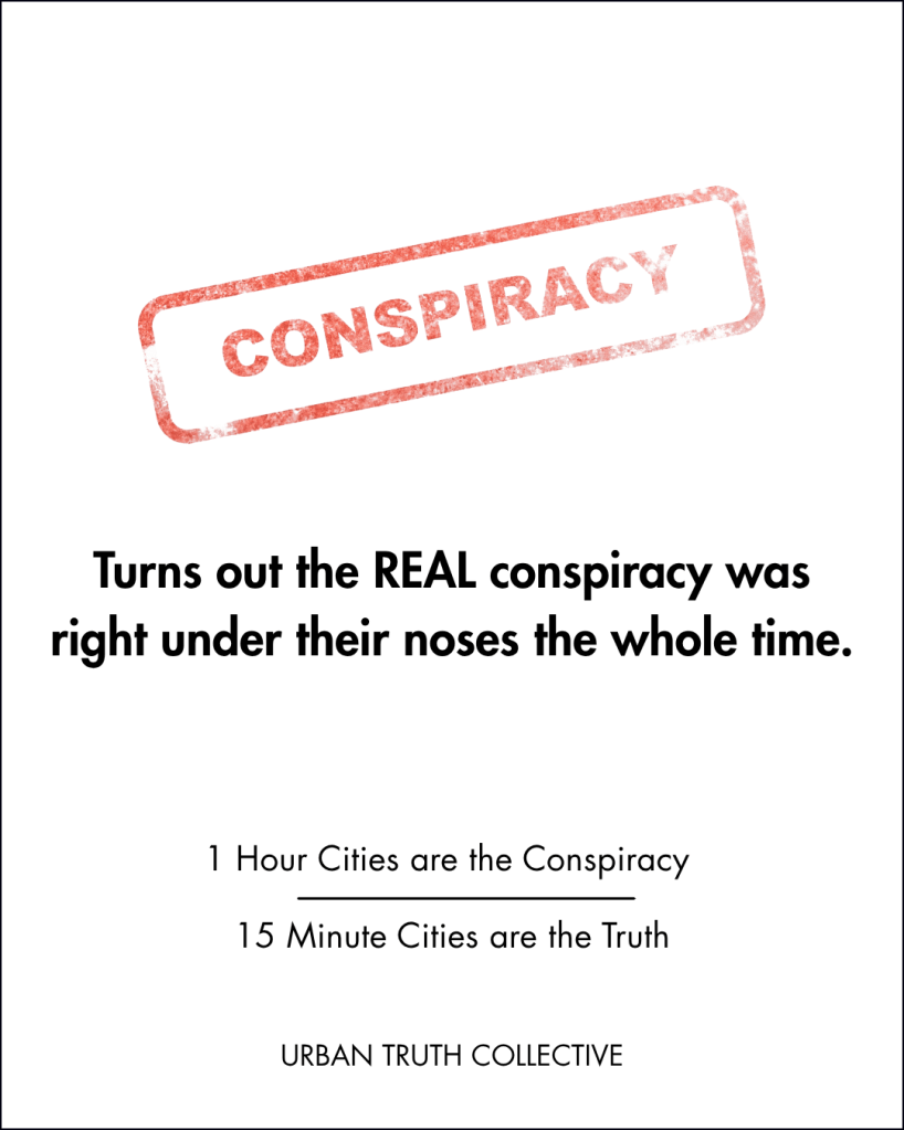 Recently “15-minute cities,” and “low-traffic neighborhoods” have been thrown into the mix of these fake conspiracy myths. Detractors claim that they’re part of a global plot to lock us up in open-air jails, undertake “government-forced isolation,” or are part of a “woke transportation” movement aiming to take away our freedoms, starting with our cars.