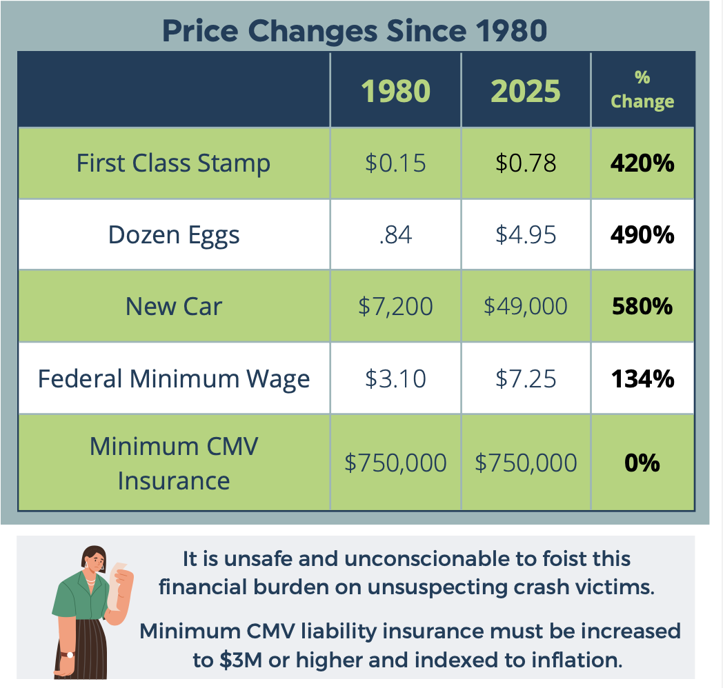 Add in 46 years of inflation, soaring medical costs, and the rising price of vehicles themselves, and crash victims who survive collisions with big rigs may be left destitute when low insurance payouts fail to cover their costs – and those who don’t survive may leave behind families who are financially devastated, too.